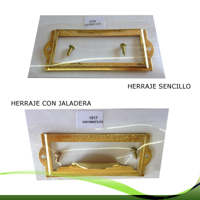 HERRAJES PARA CAJAS DE COLECCIONES ENTOMOLOGICAS. Fabricadas de lámina resistente en color dorado, con dos tipos de diseño: herraje sencillo o herraje con jaladera, ambos diseños incluyen tornillos. Herraje sencillo |